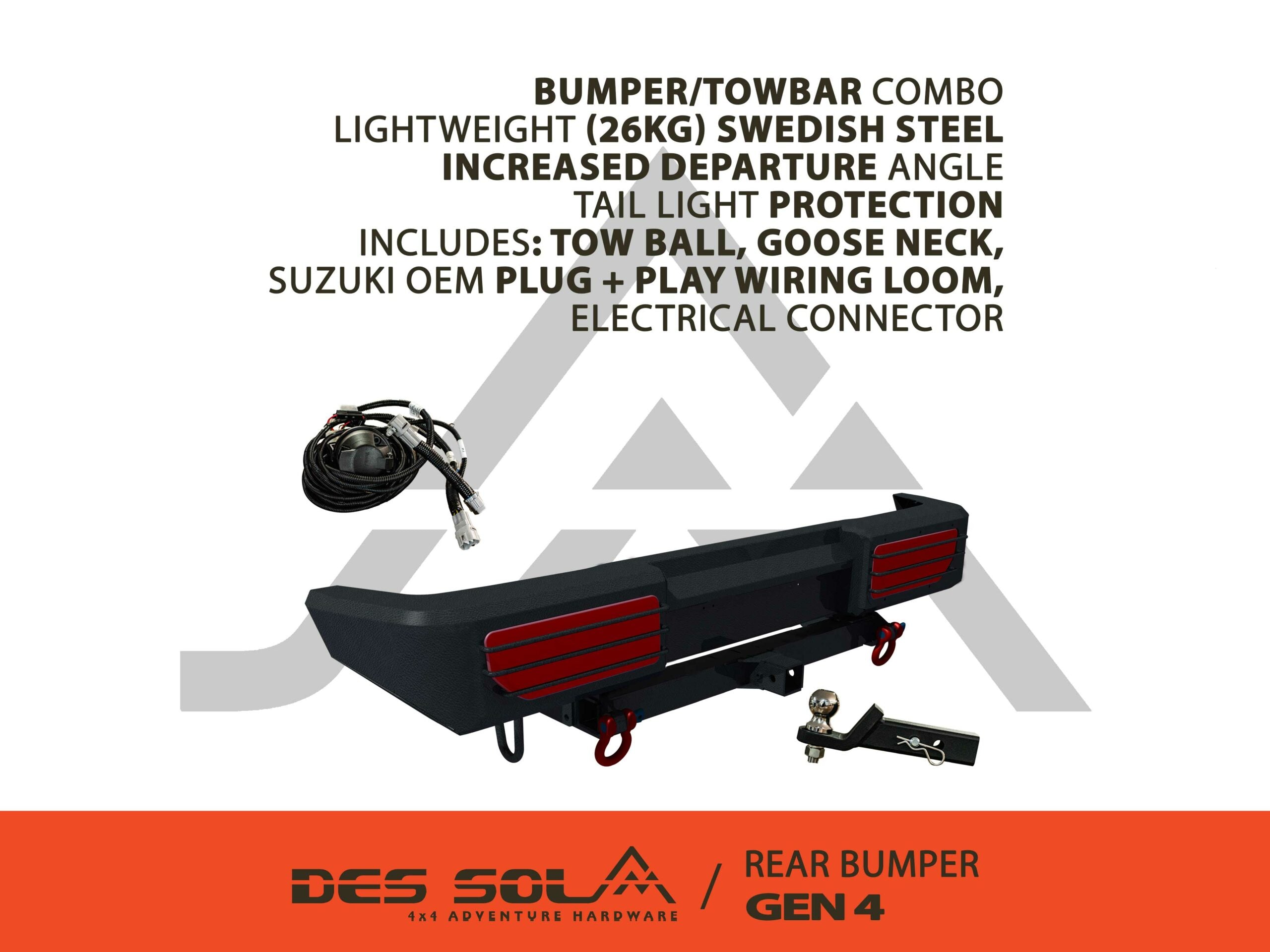 Des Sol's latest Gen4 Rear Bumper has been designed to complement their Gen4 Front Bumper and continues their design philosophy of providing a bumper which is Light Weight, Stylish, and Easy to Fit. This is again a classic DIY product for those new Gen4 Jimny fans that enjoy fitting their own accessories, with no grinding, drilling or welding required.
